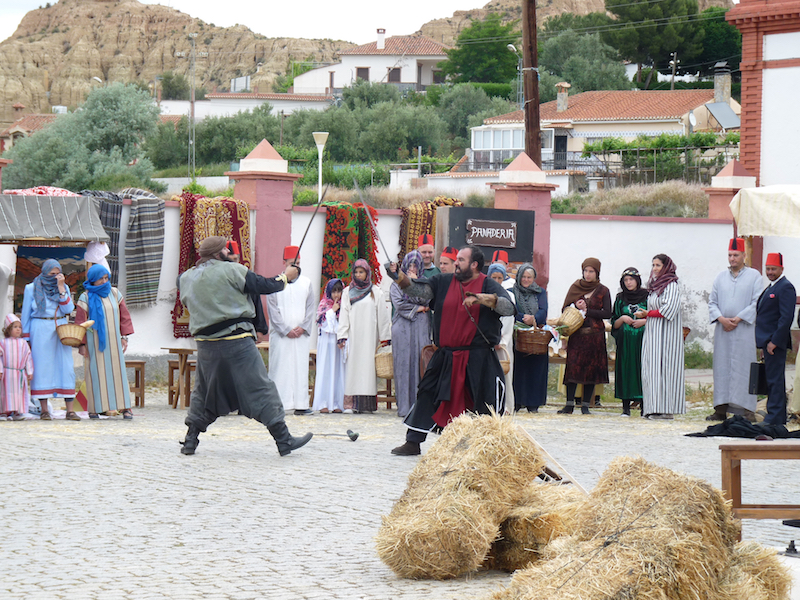 Nachdem sich alle an den Peitschen ausgetobt hatten, ging es zum Camp vor der Kathedrale, wo die letzten Besprechungen vor der großen Szene des Tages gemacht wurden. Um 14 Uhr sollte die Verfolgungsjagd auf den Motorrädern nachgestellt werden. Dies sollte ursprünglich im ausgetrockneten Flussbett des Rio Guadix stattfinden, aber da dort doch etwas Wasser floss, wurde kurzerhand ein Teil einer Hauptstraße abgesperrt, ein paar Kulissen aufgebaut, Statisten positioniert und dann das ganze recht frei, aber actionreichen inszeniert. (Auch hier hat Propstar wieder fleißig gefilmt) Ein paar Fotos anbei.