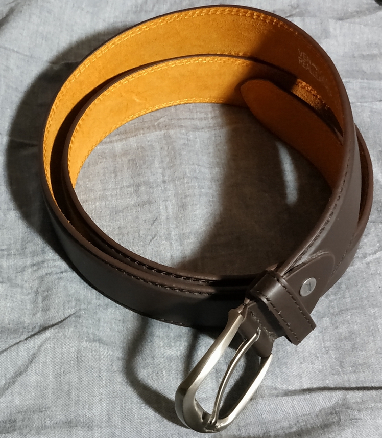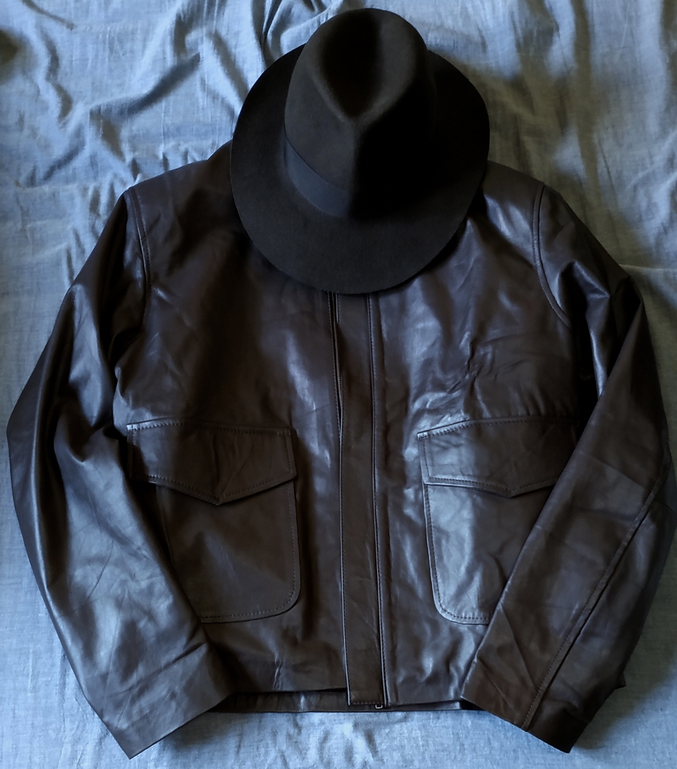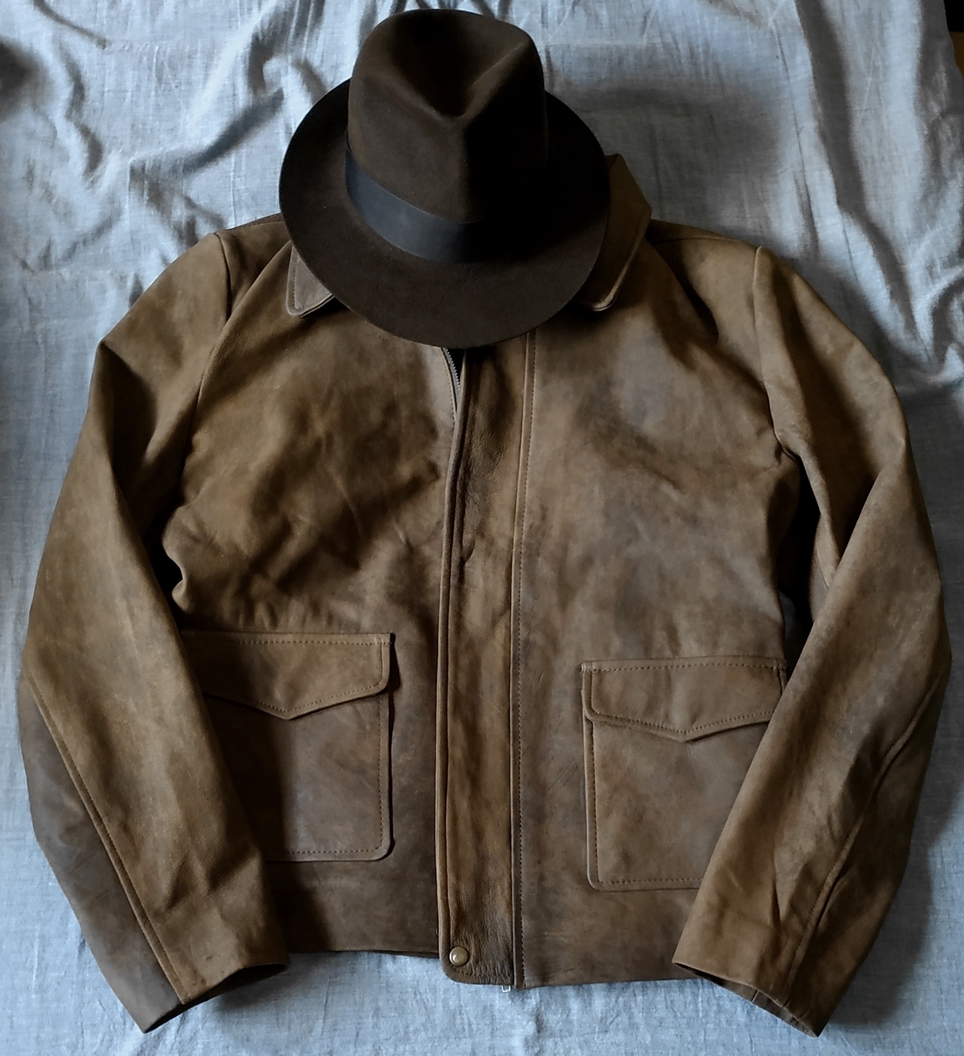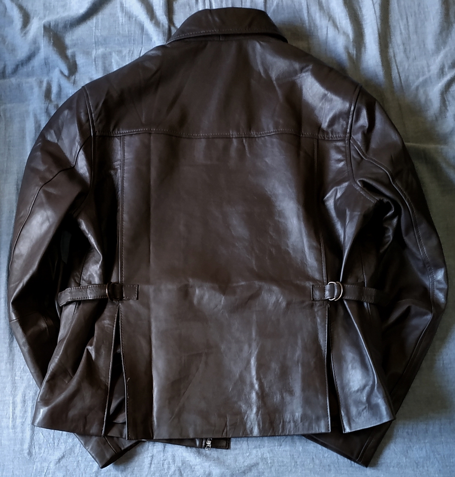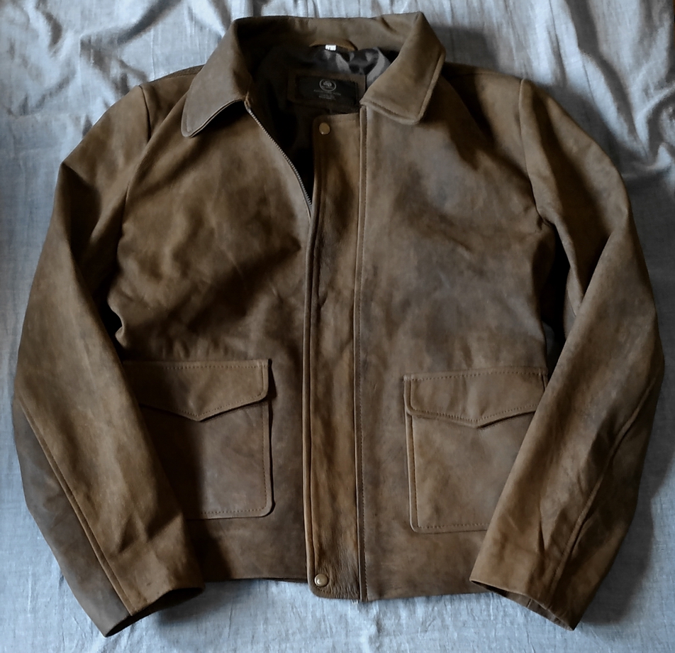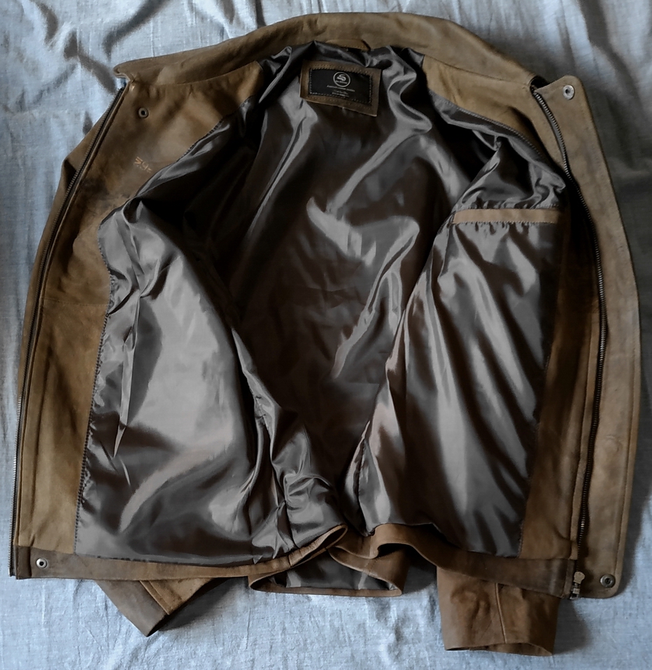 Die Jacke ist aus mittelbraunem leichtem Veloursleder. Qualität und Passform sind sehr gut. Alles ist fest vernäht, Druckknöpfe sind fest und leichtgängig, YKK Metall-Reißverschluss, Außentaschen mit Eingriff von oben, eine offene Innentasche links, hinten geschlossen, keine seitlichen Schlitze, je zwei Ringschnallen an den seitlichen Verstellern, die Enden zeigen nach vorne. Die Jacke riecht angenehm, kaum wahrnehmbar nach Leder und kann ungelüftet getragen werden. Das Innenfutter ist aus Synthetik. Auch bei warmem Wetter kann ein kurzärmliges Hemd darunter getragen werden.