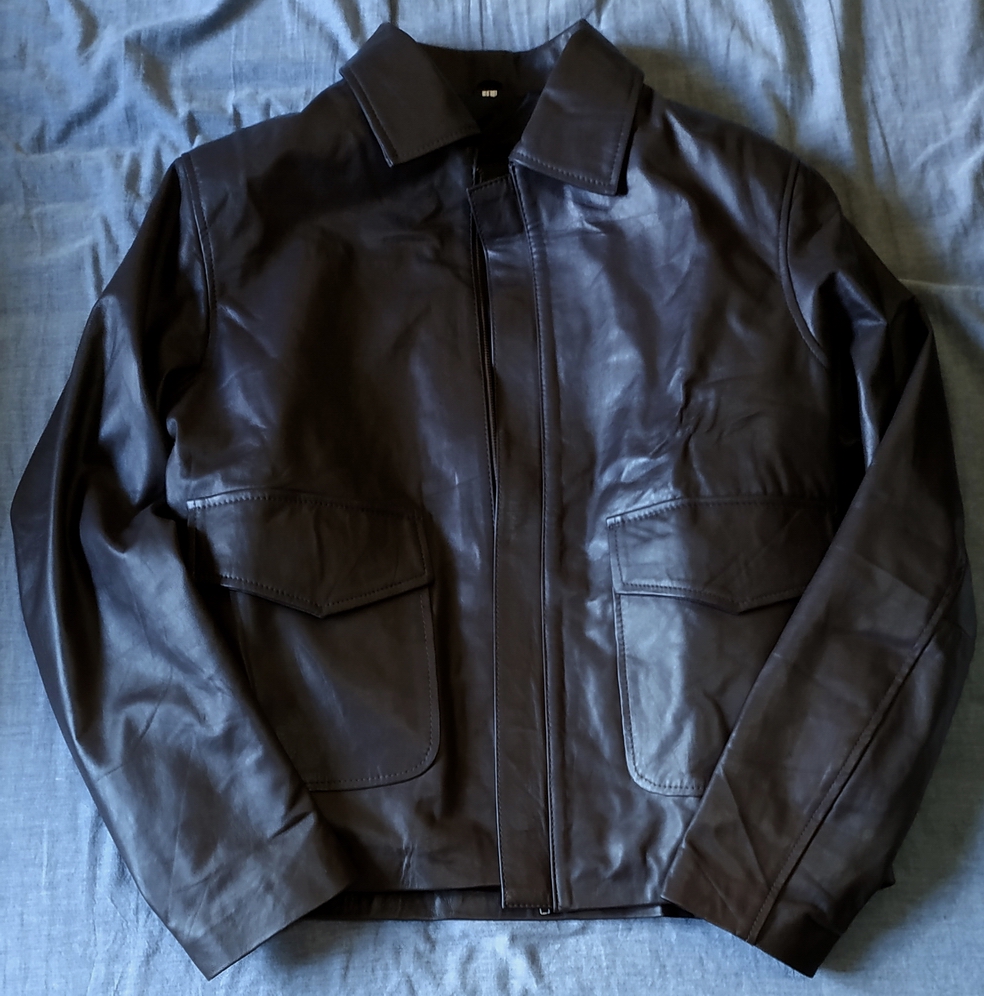 Die Jacke ist aus dunkelbraunem, leicht glänzendem Glattleder, frisch ausgepackt riecht sie kräftig, aber nach einem Tag lüften angenehm nach Leder. Die Qualität ist gut. Alles ist fest vernäht, es gibt keine Druckknöpfe an der Reißverschlussblende, YKK Metall-Reißverschluss, Außentaschen mit Eingriff von oben, zwei offene Innentaschen, hinten seitliche Schlitze, je zwei Ringschnallen an den seitlichen Verstellern, die Enden zeigen nach vorne. Obwohl das Leder angenehm weich ist, sind die Reißverschlussblende und der Kragen etwas steif. Die Jacke ist durch die seitlichen Schlitze untenrum etwas weiter, ich habe die Gurte deshalb enger gezurrt. Das Innenfutter ist aus Synthetik. Ich empfehle auch bei warmem Wetter ein langärmliges Hemd, da das Futter bei dieser Jacke zum Transpirieren führt!