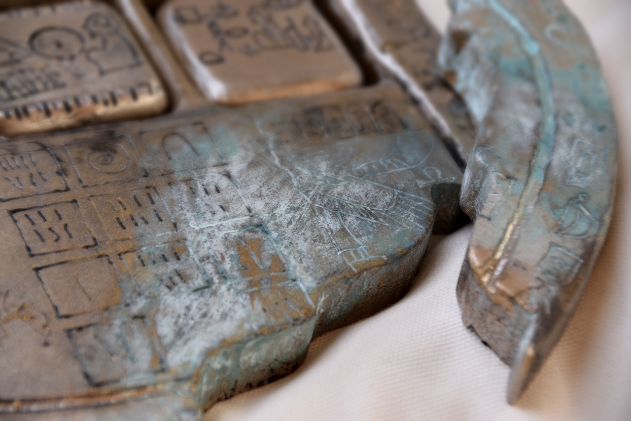ich biete hier ein Exemplar meines neuesten Vorhabens, die Tafel des Ahkmenrah aus der Filmreihe "Nachts im Museum" an. Dieses Projekt ist nun nach viel Vorzeichnen, Ausschneiden, Gießen, Schleifen, Fräsen, Färben etc. endlich fertig geworden.
