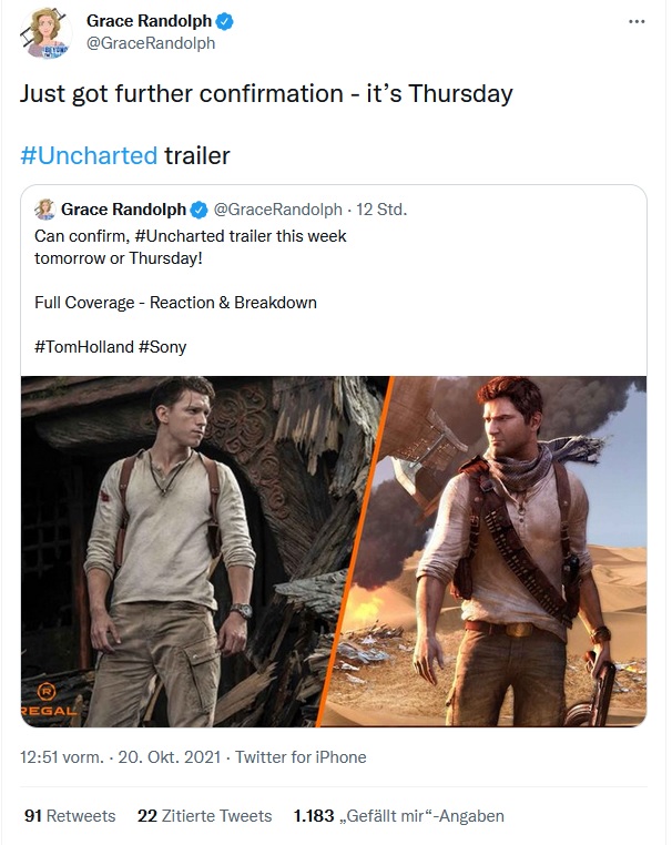[...]UNCHARTED kommt am 10.2.2022 in die deutschen Kinos. Bis dahin müssen Sie sich noch etwas gedulden und können die Vorfreude auf diesen Film genießen. Wir wünschen Ihnen heute schon einen tollen Kinobesuch und gute Unterhaltung bei UNCHARTED.[...]