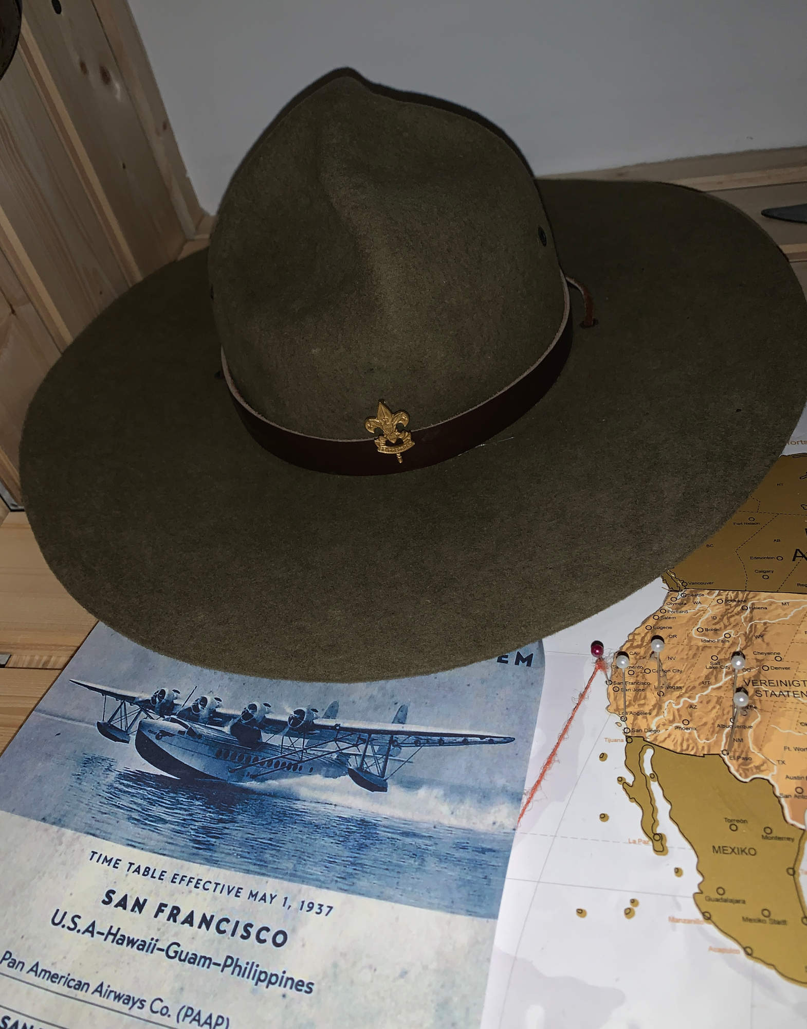 Der Hut ist ein Original Vintage Pfadfinderhut, der Pin ebenfalls. Der Hut ist zwar nicht ganz SA (der Pin schon :lol:) da der Filmhut keine Luftlöcher hat und auch das Lederband ist diskutabel. Ich fand den benutzten Hut aber schön.