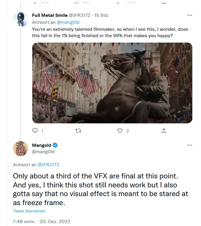 Manchen spekulieren jetzt, dass vielleicht doch Shorty vorkommen könnte. https://twitter.com/...eo7McsAAAA Noch andere spekulieren, dass da evtl. noch eine Shorty Szene gedreht werden wird?...kann ich mir nicht vorstellen. und hier spricht Mangold nochmal die VFX an. https://twitter.com/...rb5ccsAAAA Es gäbe grundsätzlich gesprochen wöchentlich neue Versionen. Insgesamt manchmal bis zu 25 Stück. Ach ja, und er arbeitet an seinem nächsten Film. https://twitter.com/...%2Fpage-32