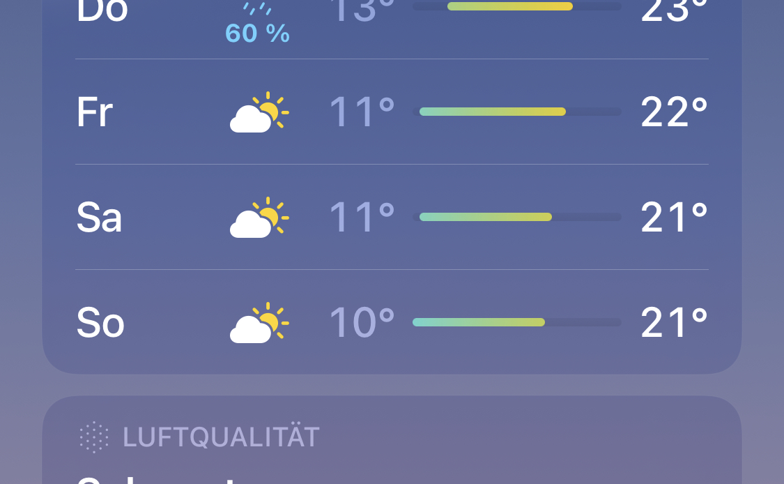 Zitat von Kukulcan:Ich habe in den letzten Jahren eine erstaunliche Verlässlichkeit dieser Vorhersagen beobachtet. Dass es max. eine sehr geringe Niederschlagsmenge geben wird, würde ich schon fast als gegeben sehen. Und beim Kanu fahren würde mich gelegentlicher leichter Regen wie damals beim Rafting überhaupt nicht stören. Ich habe da leider ganz andere Erfahrungen gemacht, zuletzt noch vor 2 Wochen, wo ich ein BBQ veranstaltet habe und das Wetter zwei Wochen vorher gescreent habe. Innerhalb dieser zwei Wochen schwankten die Wettervorhersagen von 36 Grad und knallig sonnig bis hin zu 19 Grad zu Dauerregen. Beim Kanufahren am Samstag stört das ja auch nicht so sehr. Da wird man eh nass… aber am Sonntag wäre es schon schlecht, wenn der Wettergott da nicht mitspielt 🙏🏼🤞🏼🍀