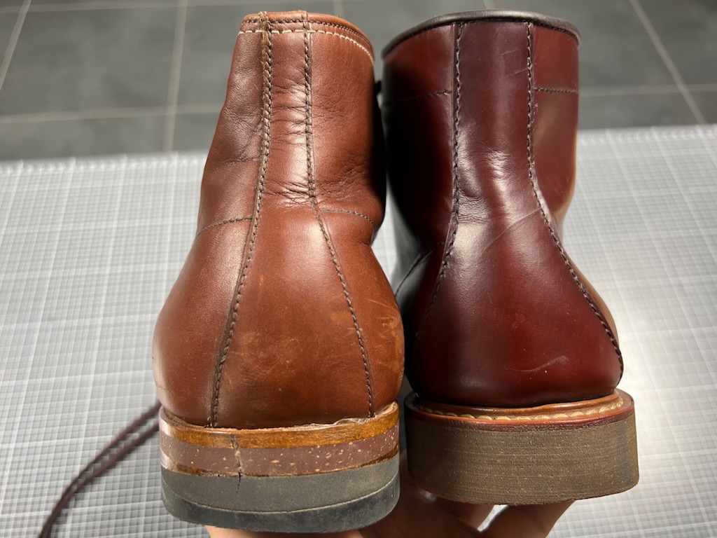 Ich bin noch nicht darin draussen herumgelaufen, was ich aus offensichtlichen Gründen auch nicht tue (gehen wohl leider zurück an den sehr netten Verkäufer), aber vom reinen Anfassen her sind die Aldens weicher und fühlen sich hochwertiger an. Ich bin kein Boot-Experte und kann nicht beurteilen, ob das Handwerk bei Alden ausreichend gut ist, um den Preis zu rechtfertigen – aber die ca. 300 ¤, die ich gebraucht bezahlt habe, würde ich wohl sofort bezahlen, wenn die Boots passen würden.