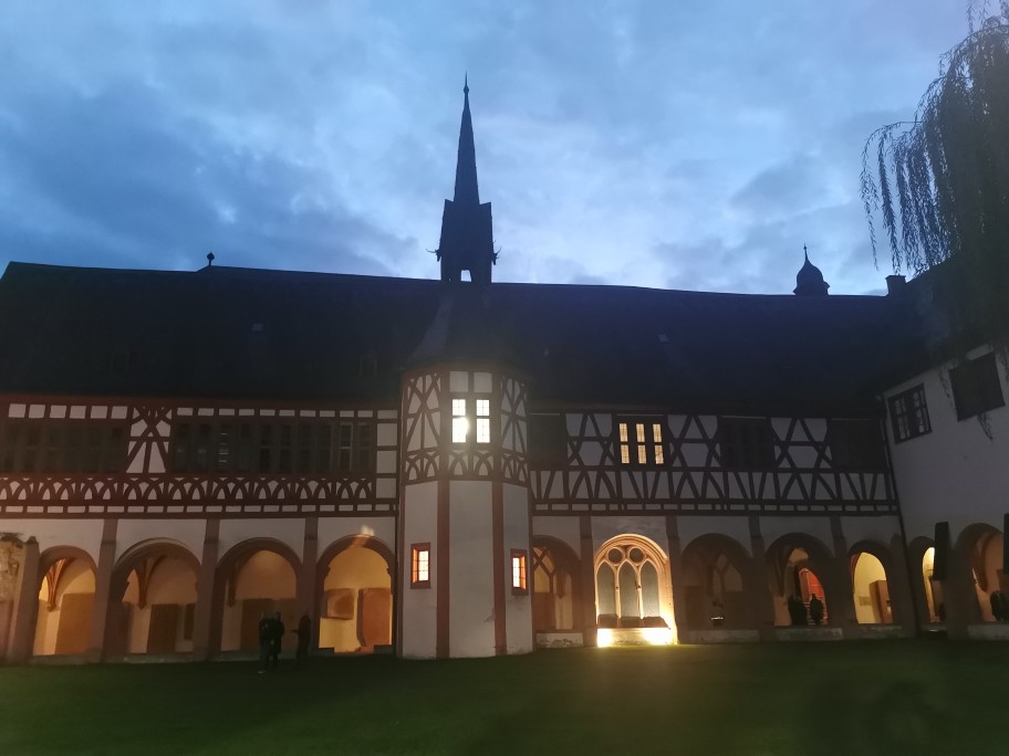 Gestartet hat das Event um 17:45 Uhr mit einer Klosterführung mit dem Fokus auf die Drehorte des Kinofilms mit Sean Connery in der Hauptrolle. Zuerst waren wir im Hospital. Dem Speisesaal im Film. Die meisten Innenaufnahmen wurden im Kloster Eberbach gedreht. Weiter ging es in den Cabinetkeller. Der schwarze Keller, wo die Liebesszene und die Klosterapotheke gedreht wurde, ist Tabu und für die Öffentlichkeit nicht zugänglich. Wir waren auch im großen Schlafsaal. Dort lebten bis zu 150 Mönche. Im Film war dieser Raum das Skriptorium / Schreibstube der Mönche und der Ort mit der geheimnisvollen Tür zum Turm. Im Erdgeschoss waren wir noch im Kapitelsaal (erster Schlafsaal des Klosters).