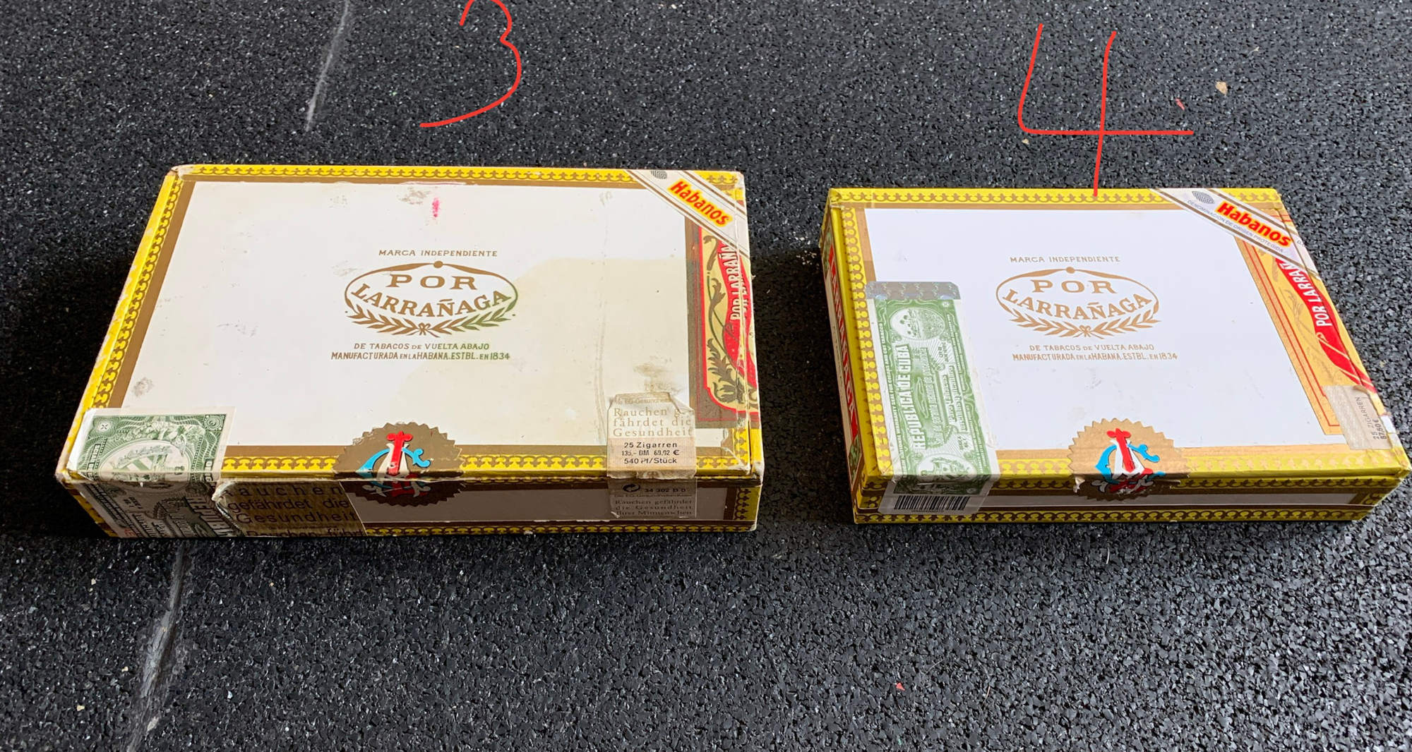 1.) 25x14cm Picadores 2.) 22x18cm Lonsdales 3.) 23x14,5cm Lolas en Cedro 4.) 19x14,5cm Panetelas Verglichen mit den Screenshots würde ich mittlerweile sagen, dass es anhand der Ratio und Größe, die Nr. 2, die Londstales Kiste ist, die im Film zu sehen ist.