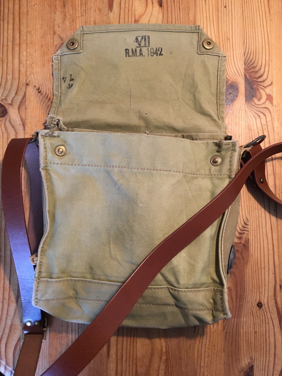 - MK VII Tasche, durchgescheuerte Stelle Rückseite, eine Stoflasche leicht beschädigt. Lässt sich reparieren und hat noch einige Jahre aktive Verwendung vor sich. Dazu neuer Lederriemen (weiß nicht mehr, welcher Hersteller).