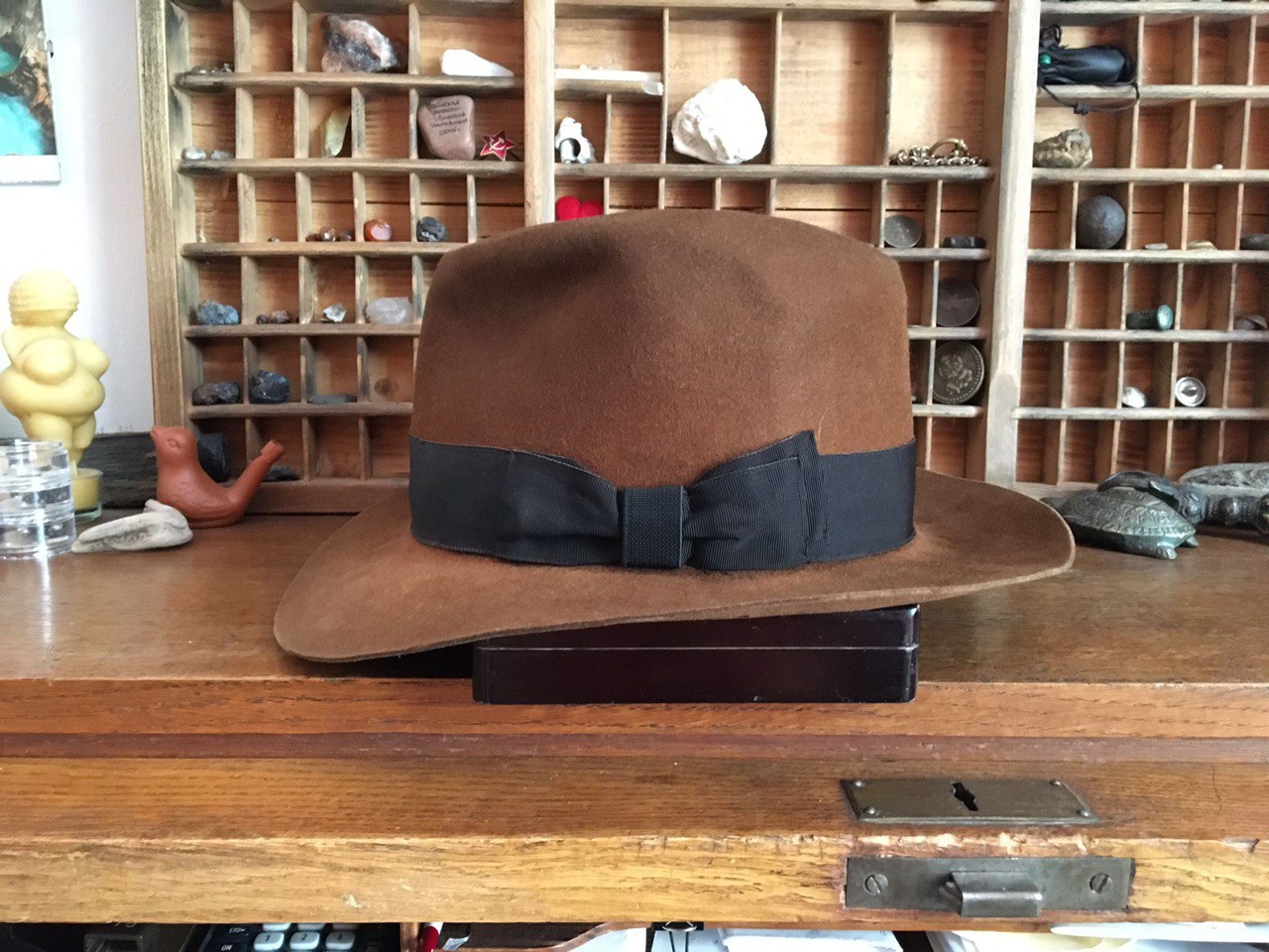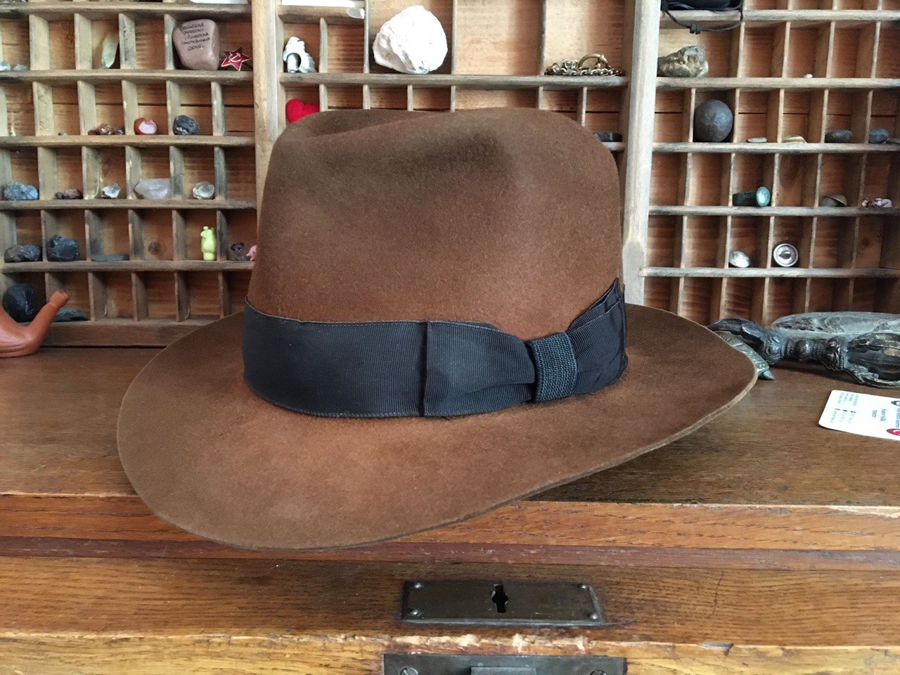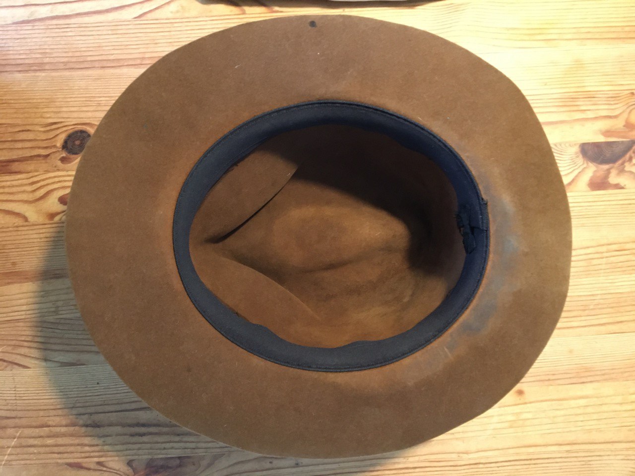 original Steven Delk Adventurebilt hat, Größe ca. 56-57, der 1. (!) Generation. Ich denke, er war einer der ersten ca. 50 Hüte, die Steven ursprünglich hergestellt hatte. Das ursprünglich zu Breite Hutband ist mit einem authentischeren Hutband von Mayser ausgetauscht. Das Schweißband wurde mit deutlich angenehmeren Stretchband getauscht und das Innenfutter entfernt. Der Hut wurde einmal umgestülpt und neu geblockt, an der Unterseite der Krempe ein kleines Brandloch. Der Hut ist frisch gereinigt und kann entweder sofort verwendet werden oder neu geblockt werden.